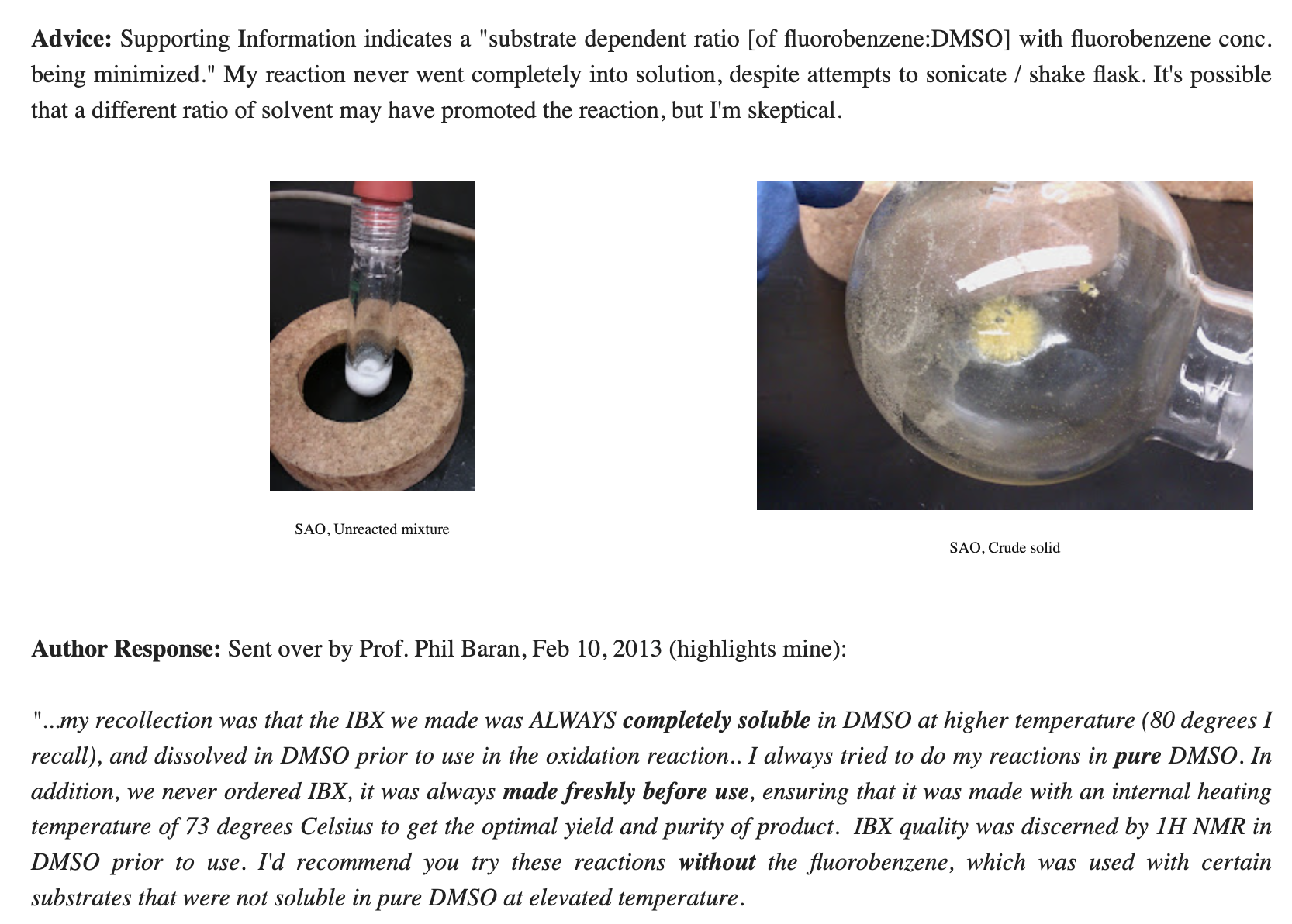 For non-scientists, the story of BlogSyn may help to illustrate what I mean. BlogSyn was a project in which professional organic chemists attempted to reproduce published reactions based only on the procedure actually written in the literature. On paper, this seems like it should work: one expert scientist reads a peer-reviewed publication with a detailed experimental procedure and reproduces a randomly chosen result. In two out of three cases, however, the authors were unable to get the reaction to work as reported without consulting the original authors. (The saga with Phil Baran lasted about a month and became a bit acrimonious: here’s part 1 and part 2.)